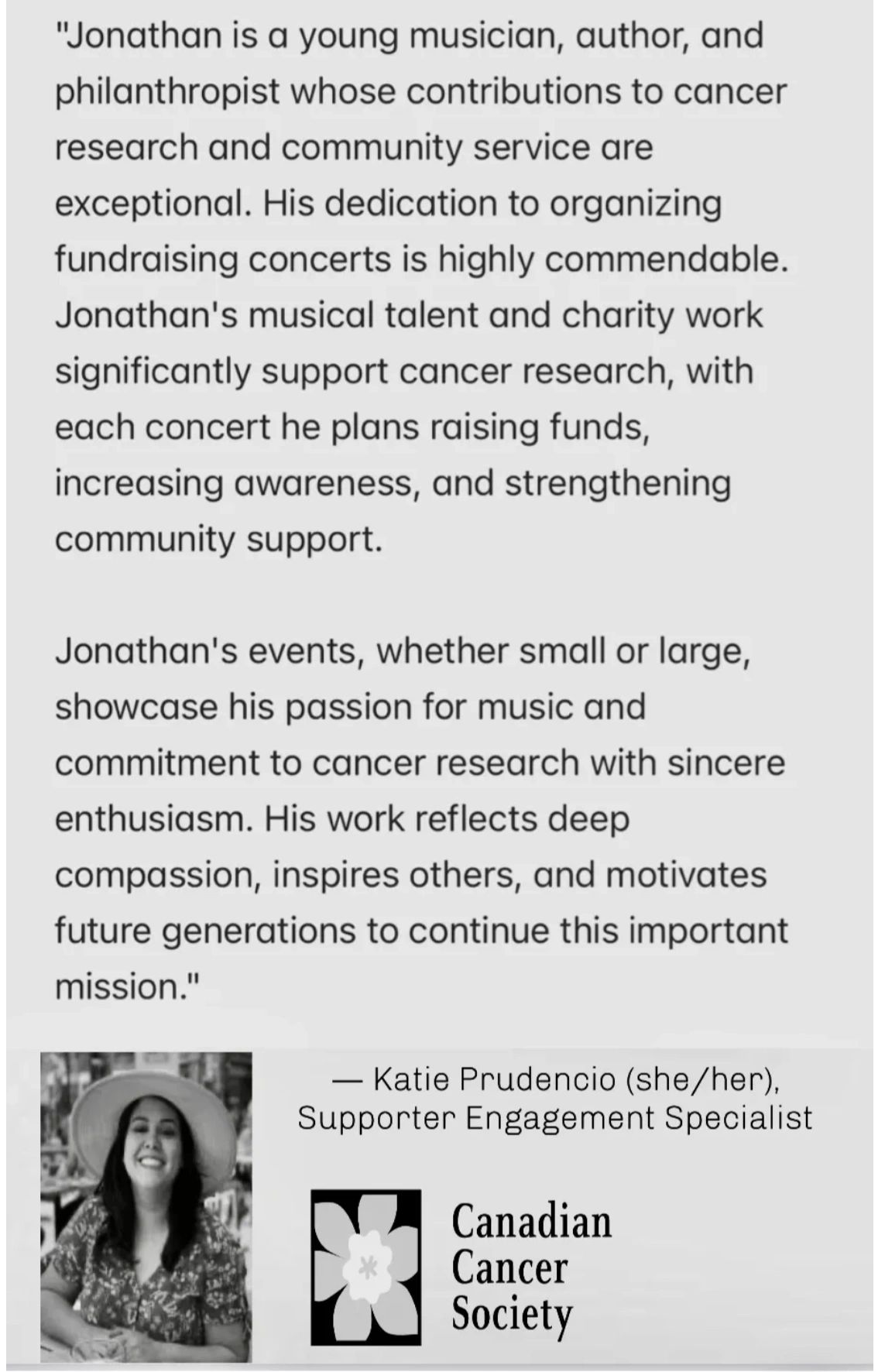 "Jonathan is a young leader dedicated to philanthropy and community service.  He organizes multiple fundraising  events for cancer research, using his musical talents to raise awareness and inspire others to support important causes.”