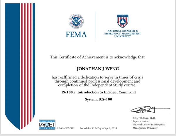 Certificate of Introduction to Incident Command System.
