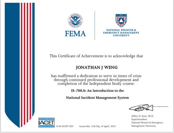 Certificate for Introduction to the National Incident Management System.