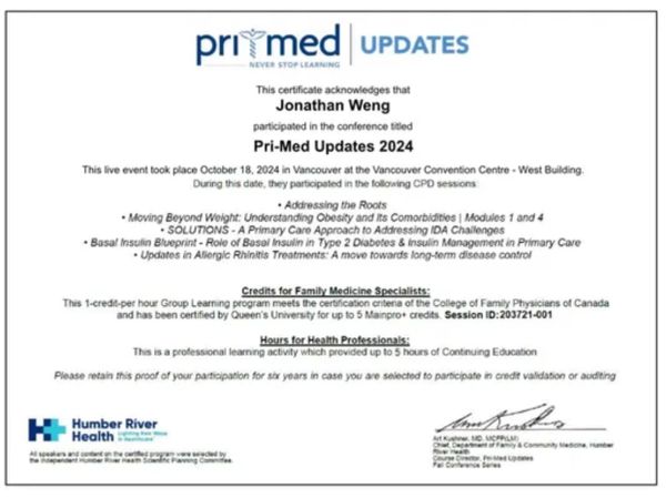 Awarded 5 Mainpro credits - Pri-Med Updates 2024