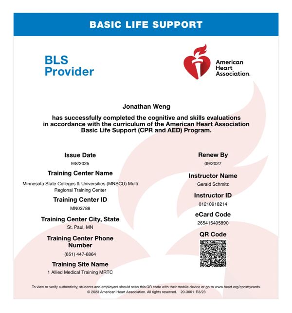 Certificate of AHA Basic Life Support