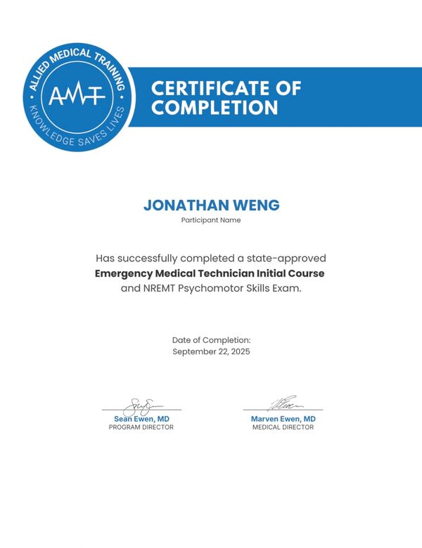 Certificate of Completion for the state-approved EMT Course and NREMT Psychomotor Skills Exam